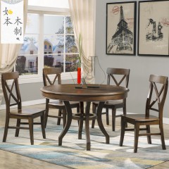 如本木制美式乡村实木餐桌椅组合圆形欧式复古吃饭桌子带圆桌转