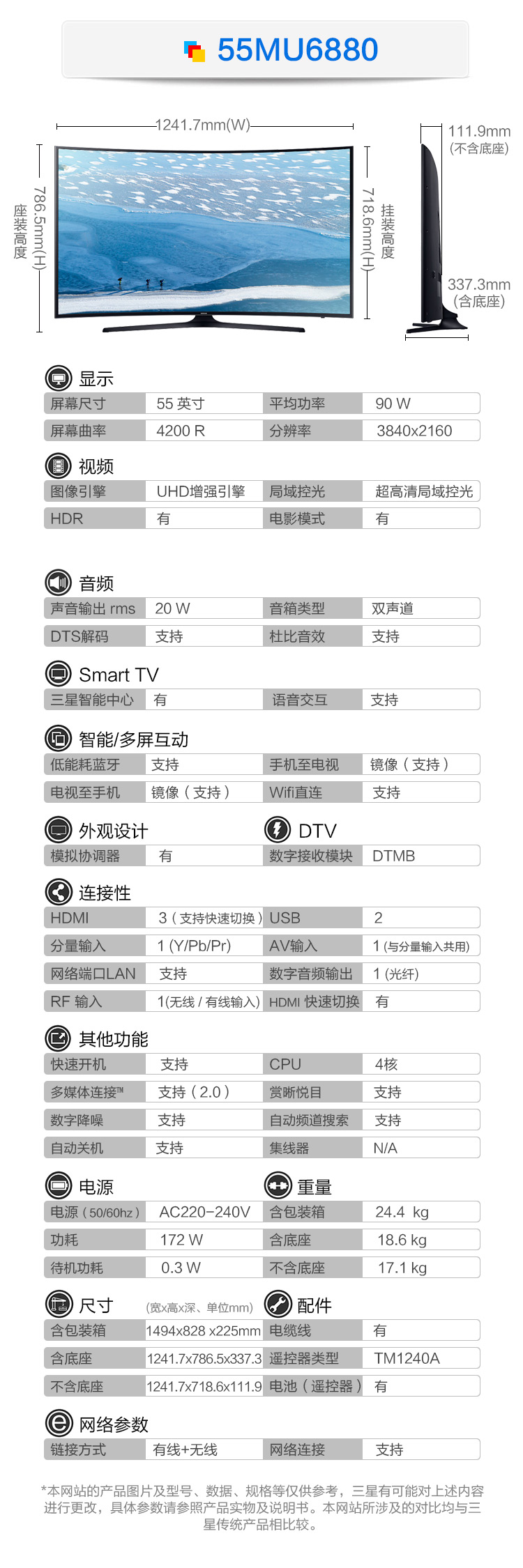 商品名称:三星(SAMSUNG) UA55MU6880JXXZ 55英寸 4K 智能网络曲面液晶电视