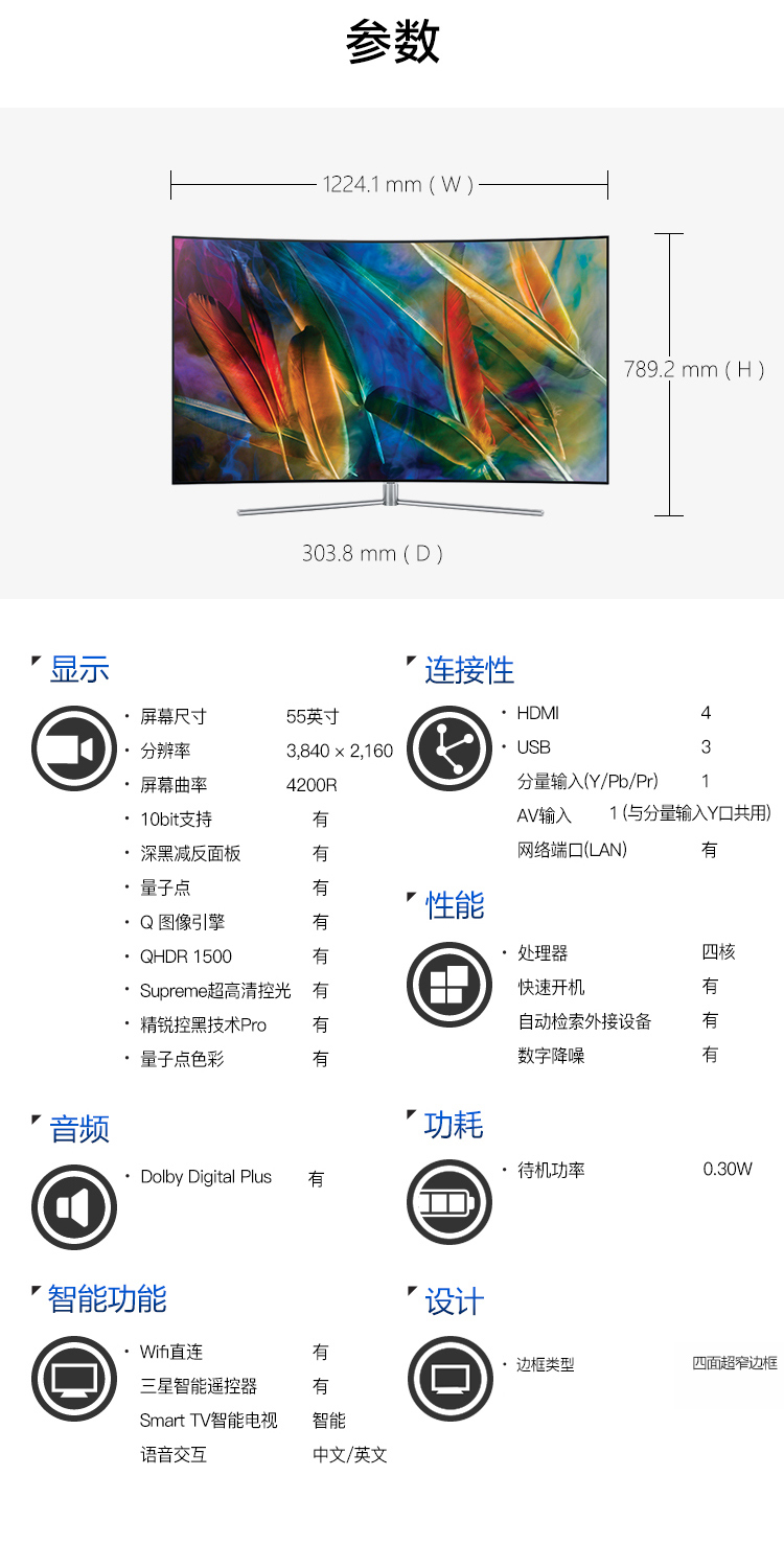商品名称:三星(SAMSUNG)QA55Q7CAMJXXZ 55英寸 曲面QLED光质量子点 HDR