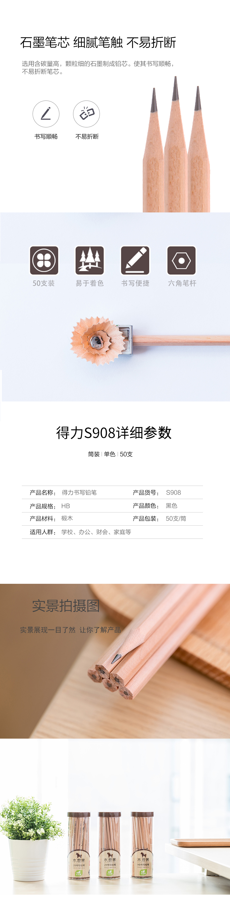 商品名称:得力(deli)原木HB铅笔素描绘图学生铅笔 50支/桶 S908