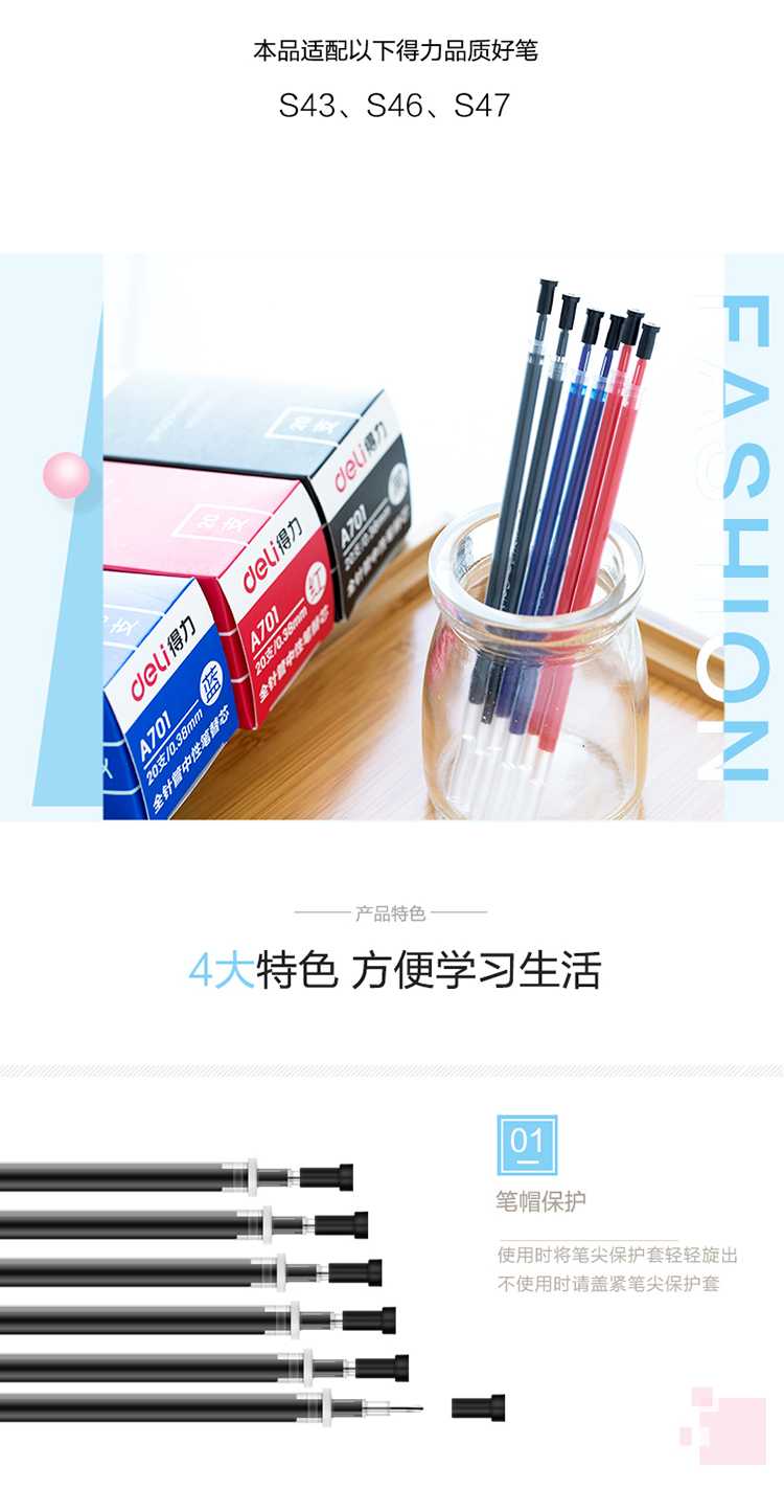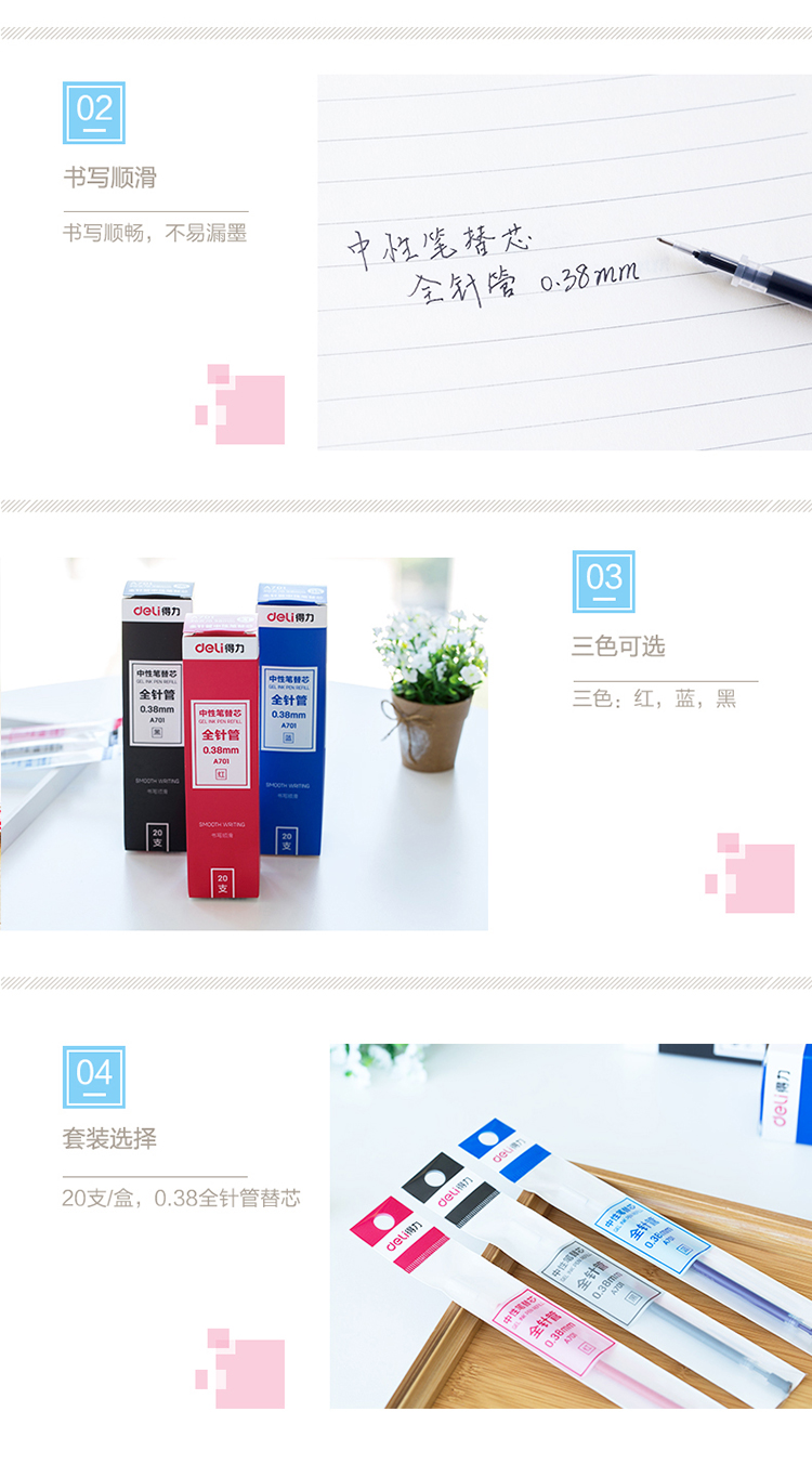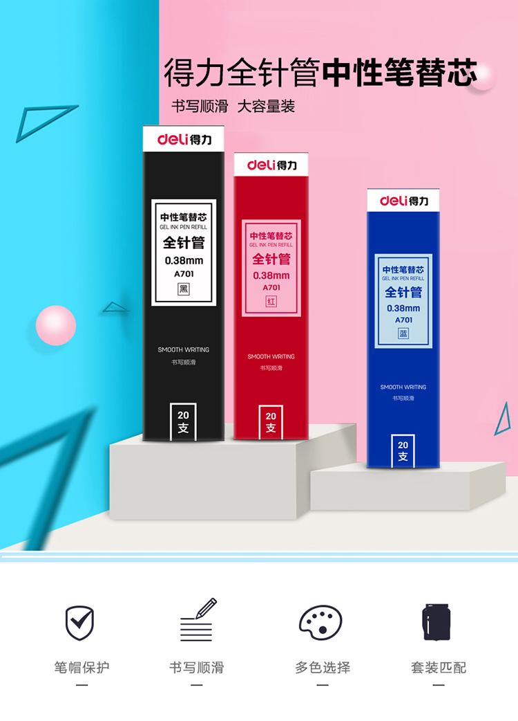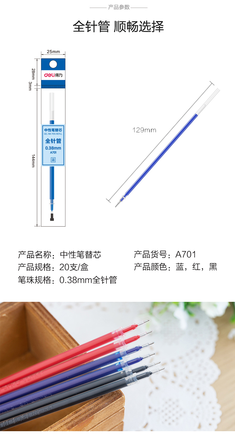 商品名称:得力(deli)全针管0.38mm蓝色中性笔水性笔签字笔替芯 20支/盒A701