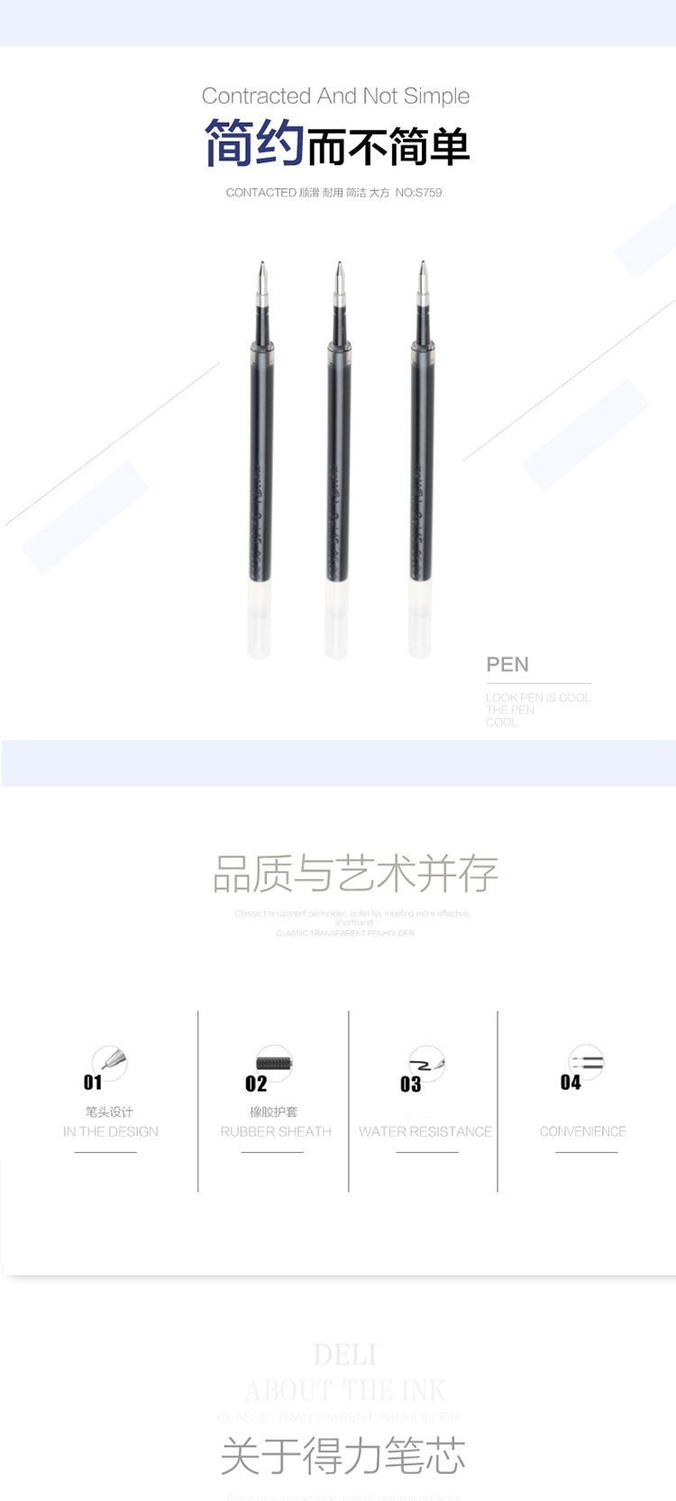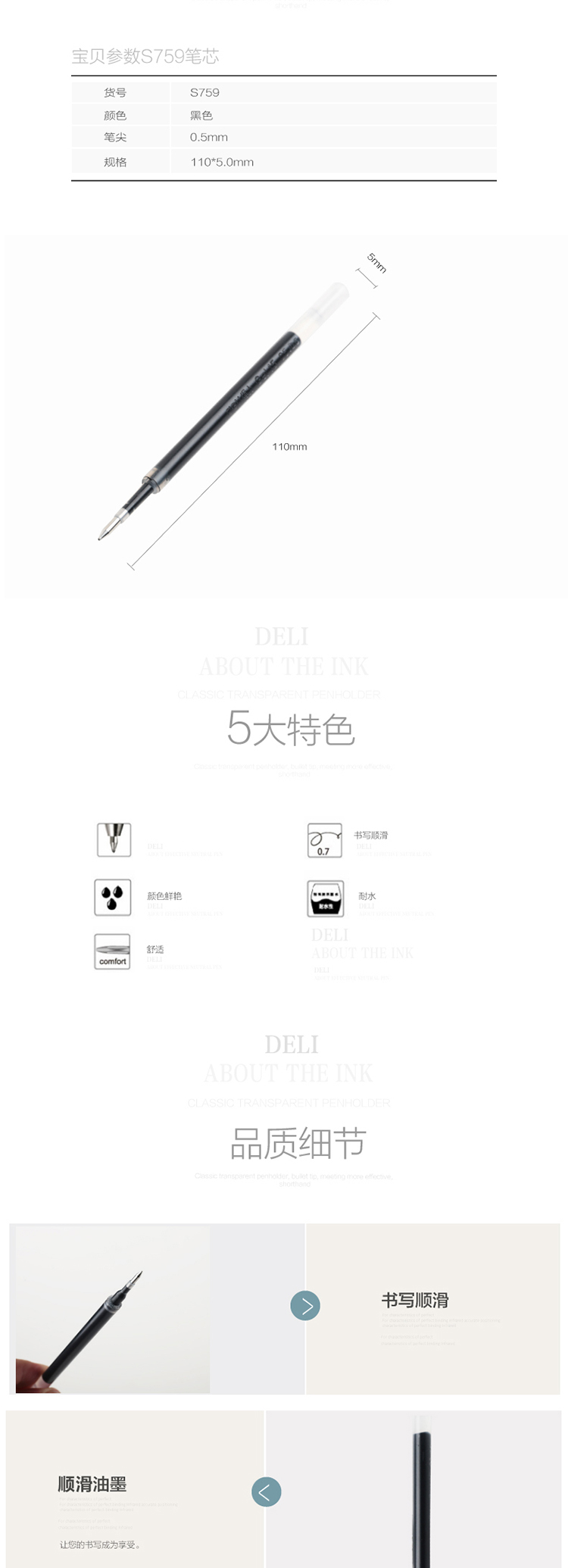 商品名称:得力(deli)大容量0.5mm黑色笔芯 中性笔水性笔签字笔 子弹头替芯 20支/盒