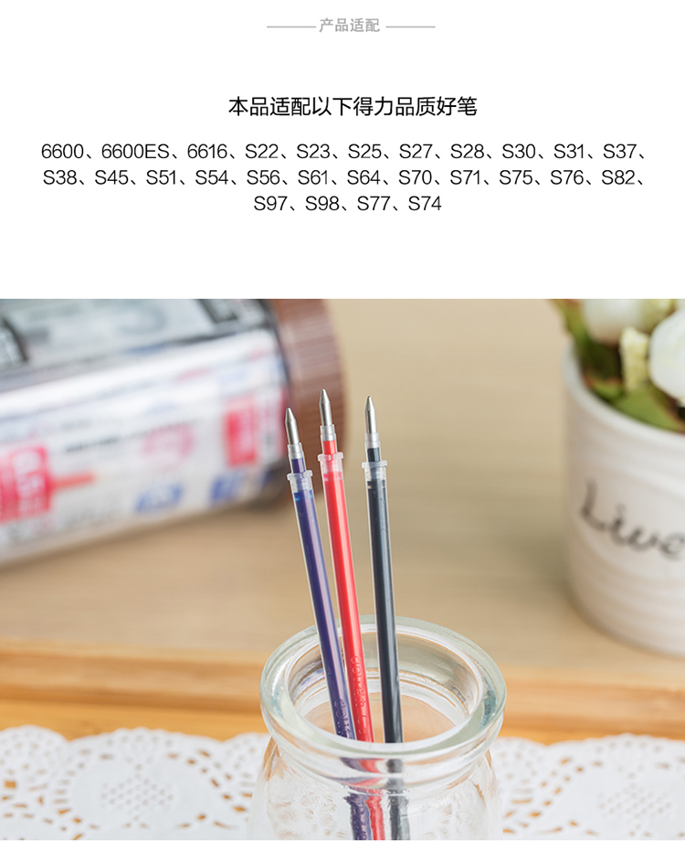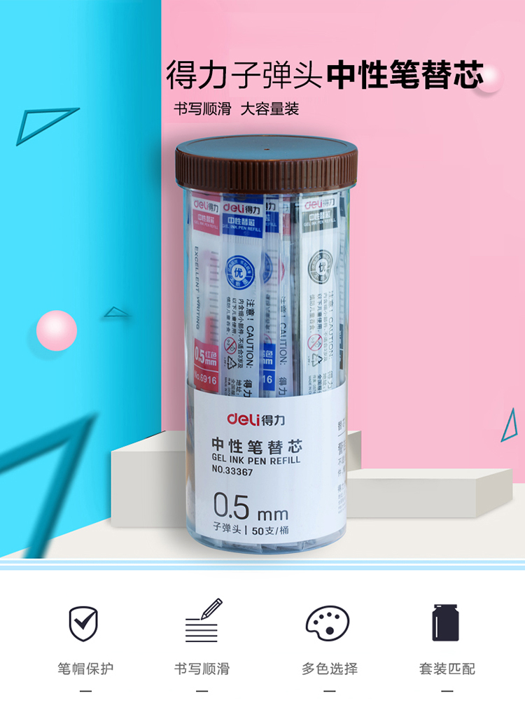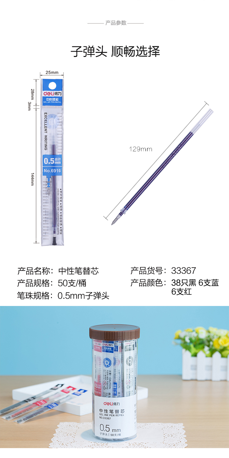 商品名称:得力(deli)0.5mm混色中性笔签字笔替芯 50支/盒(38黑+6蓝+6红)33367