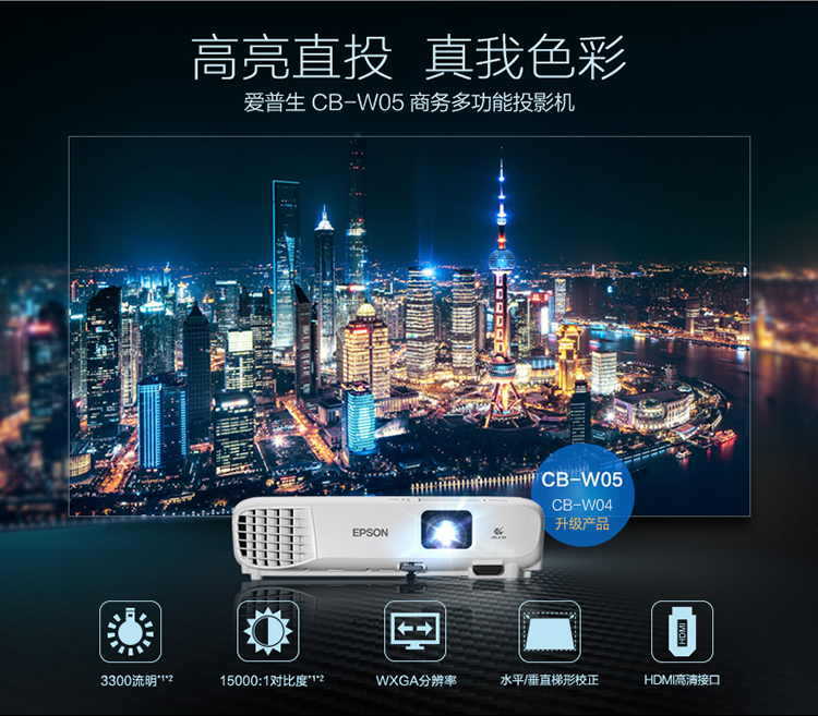 商品名称:爱普生(EPSON)CB-W05 办公 投影机 投影仪(3300流明 WXGA分辨率 支持左右梯形校正