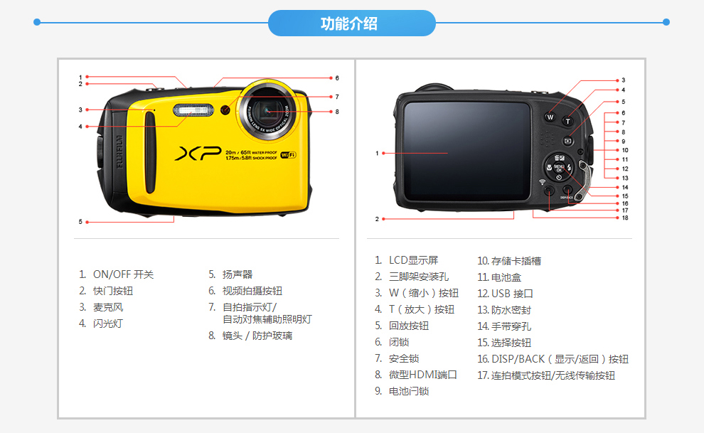 商品名称:富士(FUJIFILM) XP120 四防运动数码相机 防水防尘防震防冻(天空蓝)