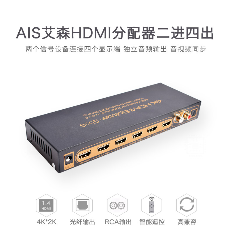 艾森(AIS)hdmi分配器2进4出 HDMI矩阵切换器二进四出高清视频4