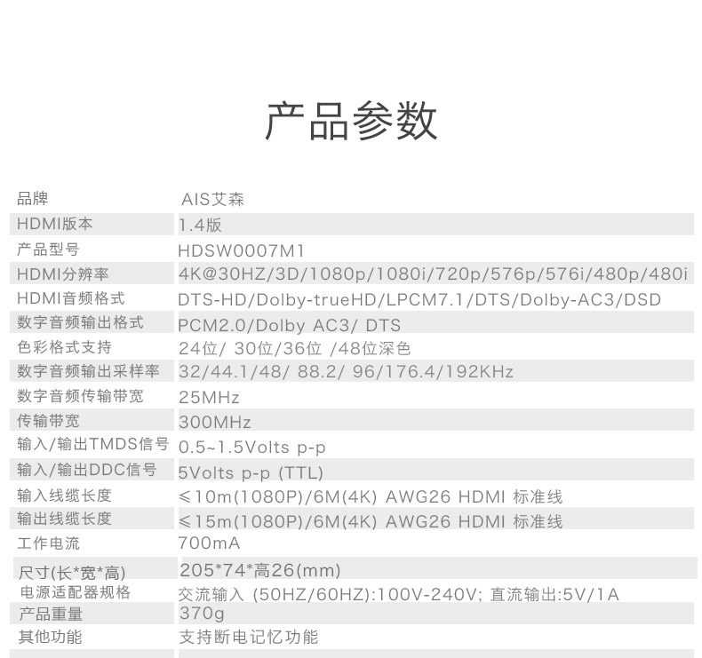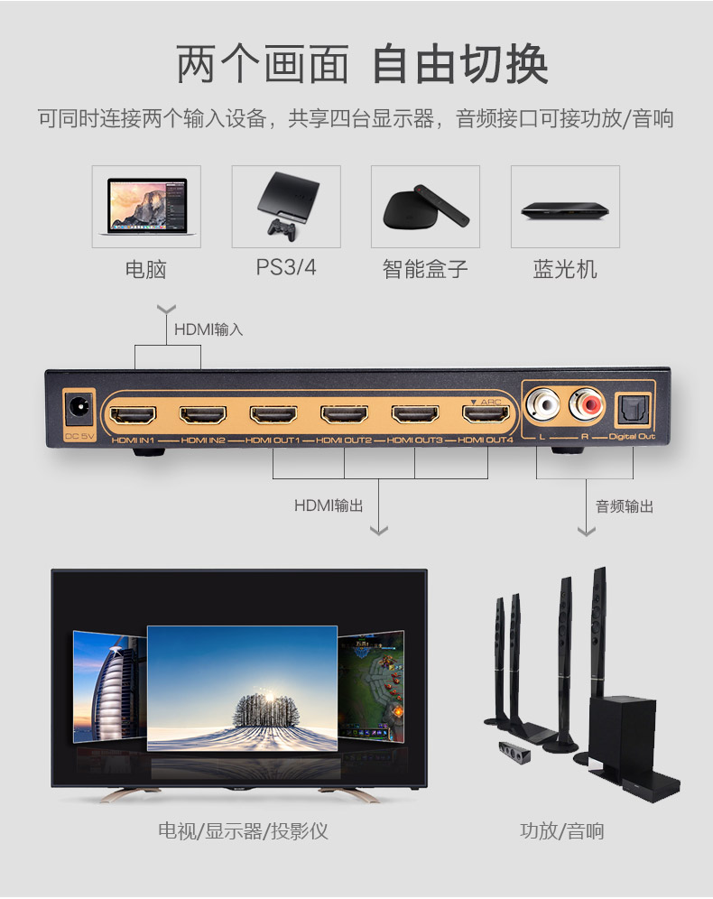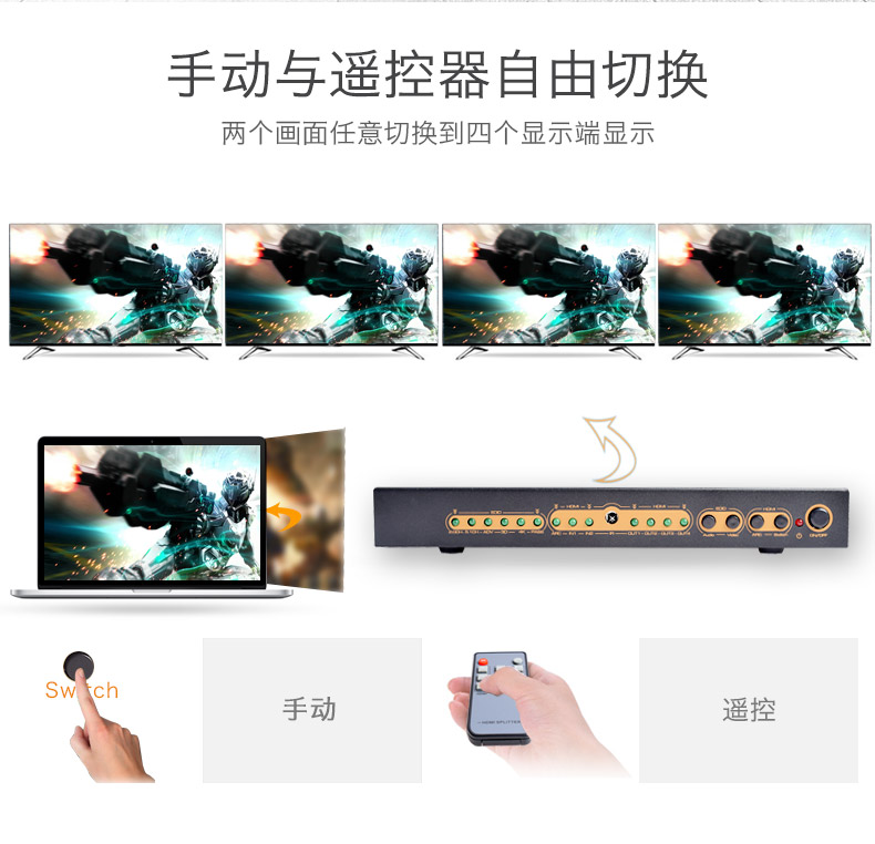 商品名称:艾森(AIS)hdmi分配器2进4出 HDMI矩阵切换器二进四出高清视频4