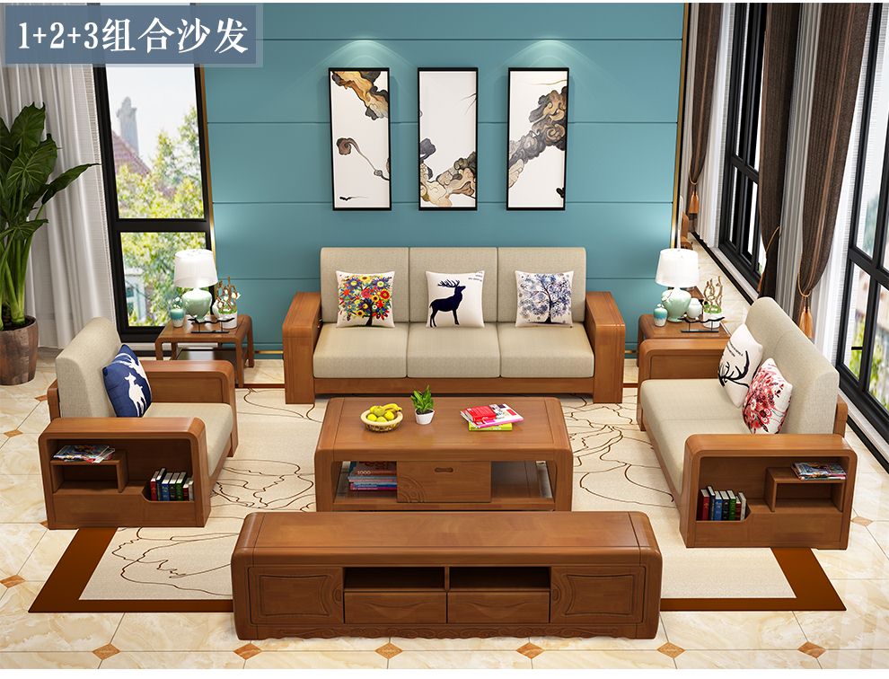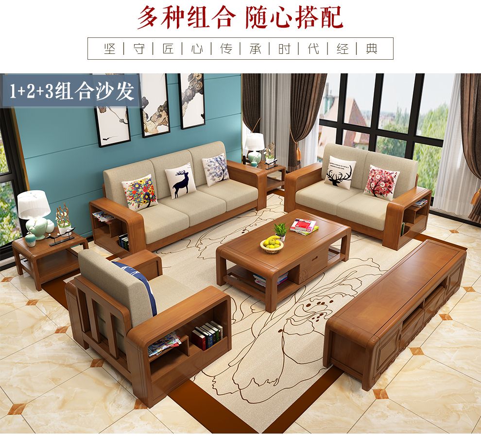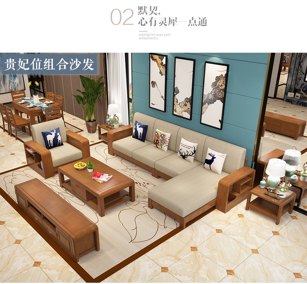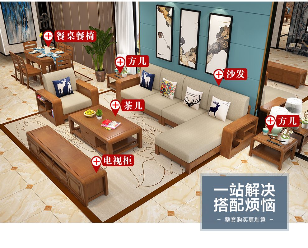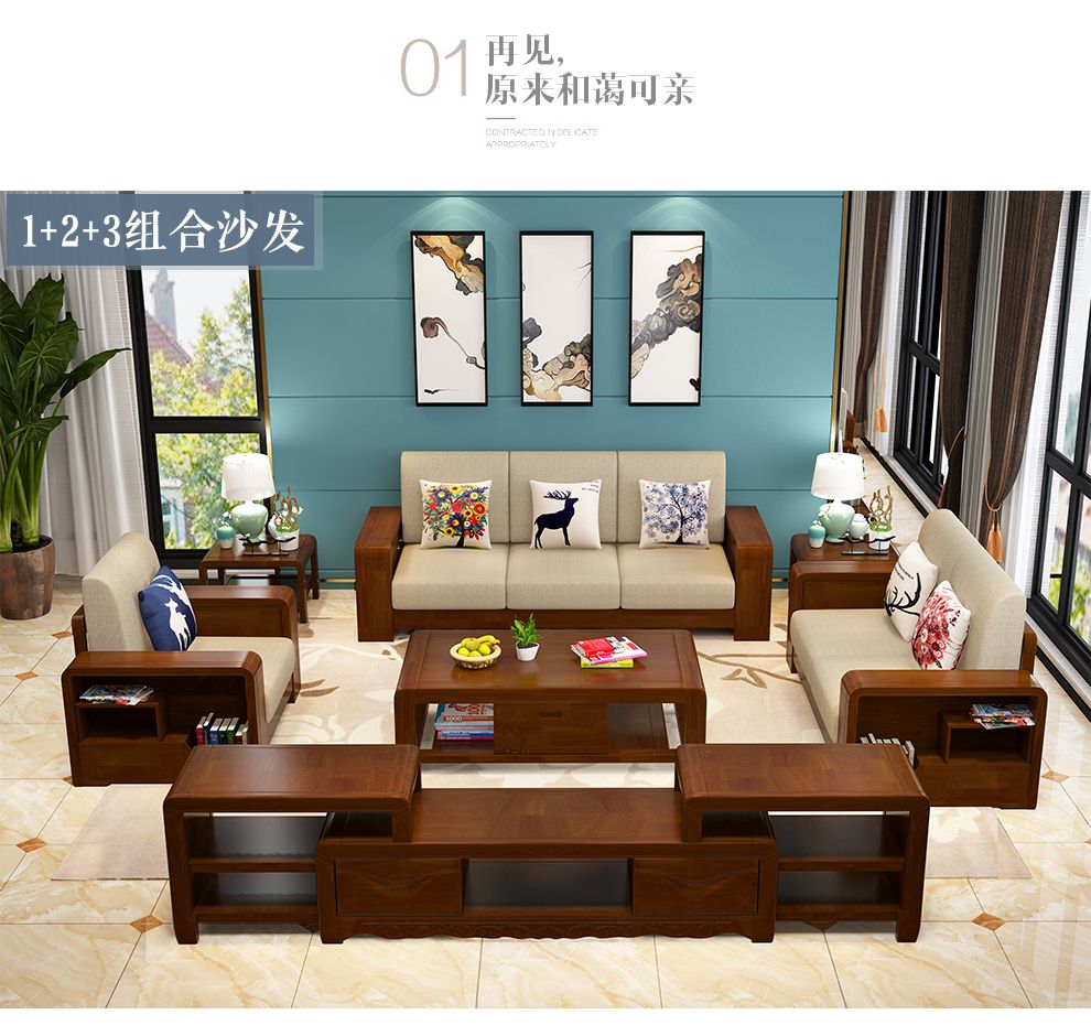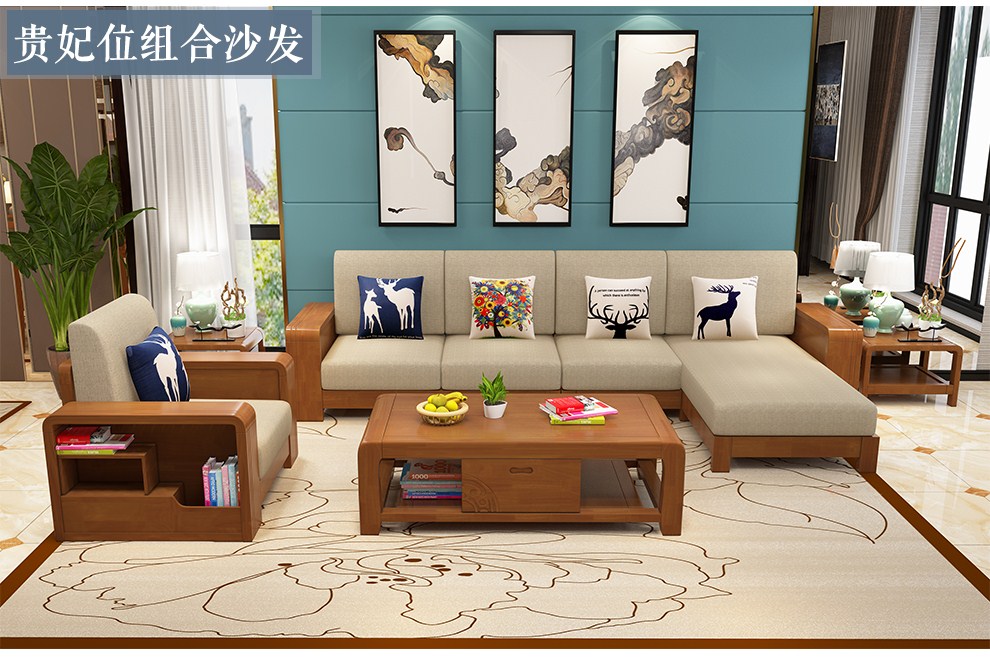 商品名称:布匠家私 全实木沙发组合现代中式 贵妃转角木质布艺沙发可拆洗